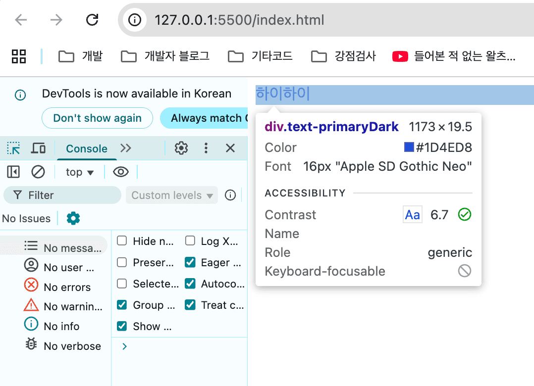 아래와 같이 index.html을 만들고 빌드된 css mini-tailwind.css를 연결, 약속된 class text-primaryDark 를 입력했다.