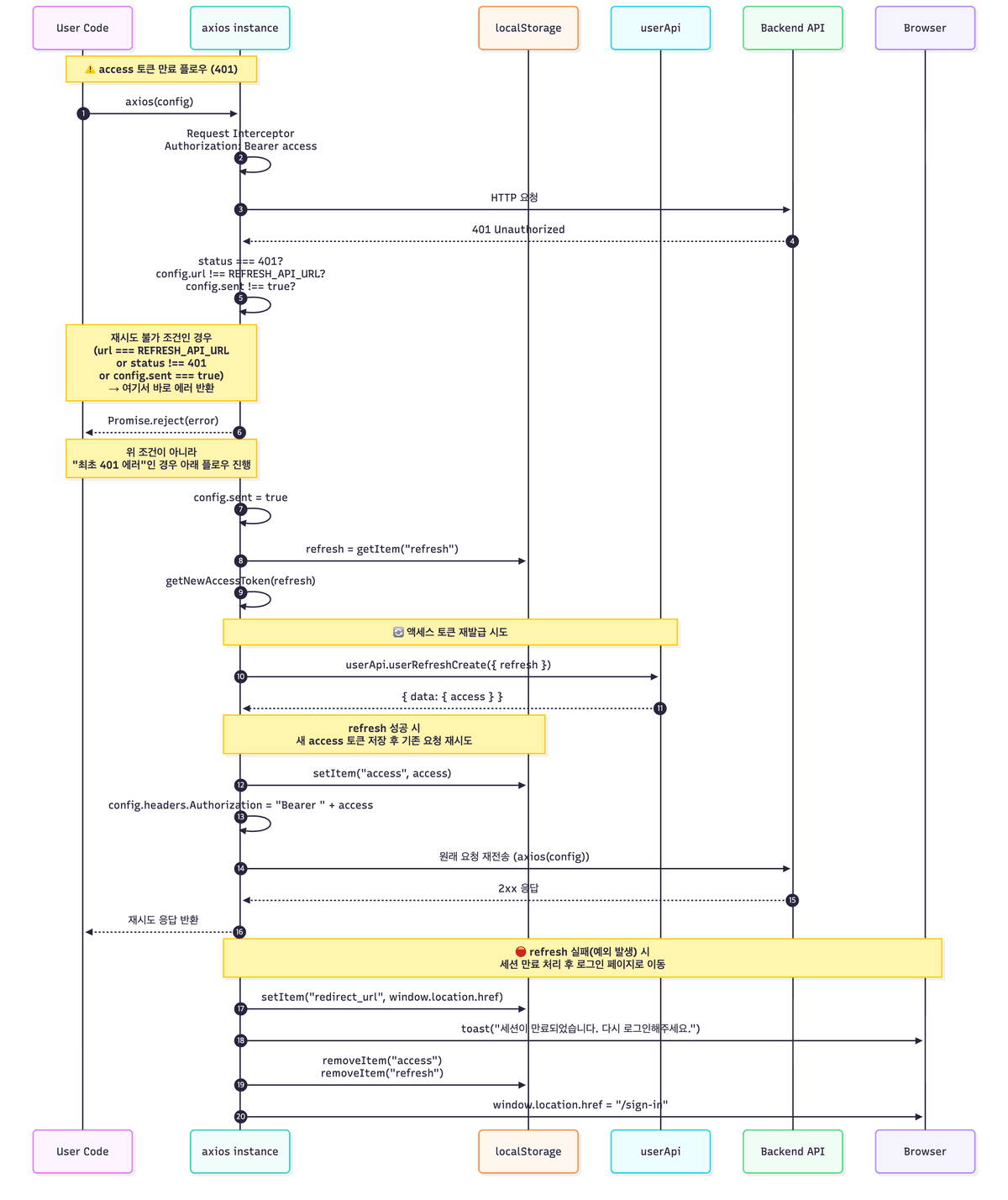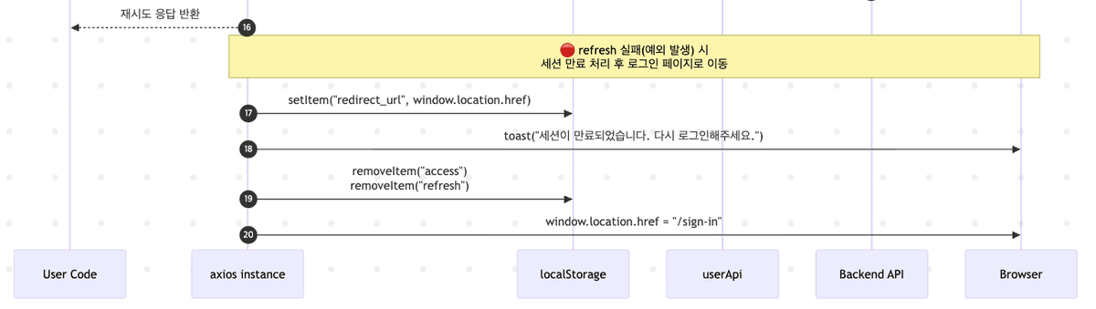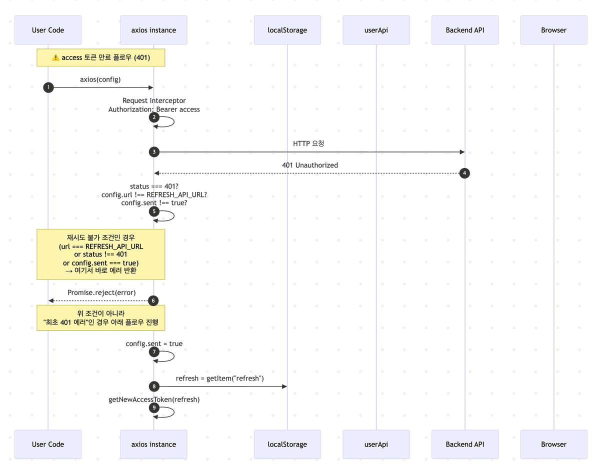 • status !== 401: 에러코드가 200, 300, 500, 404 등 인증만료 코드가 아닌 곳에서의 에러인데 이는 각 상황에 맞는 에러처리를 해야 한다.